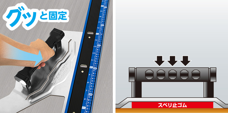 「スライド・ストップシステム」により通常はスベリ止ゴムが浮いている為、スムーズにスライドできます。
